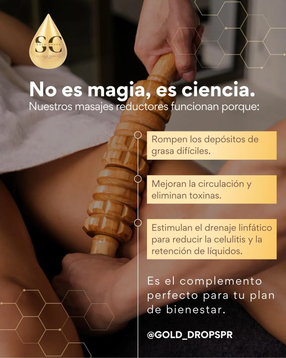 Masajes reductores, maderoterapia, cavitación, radiofrecuencia y vacuum terapia. Ideal para abdomen, espalda, muslos y glúteos.